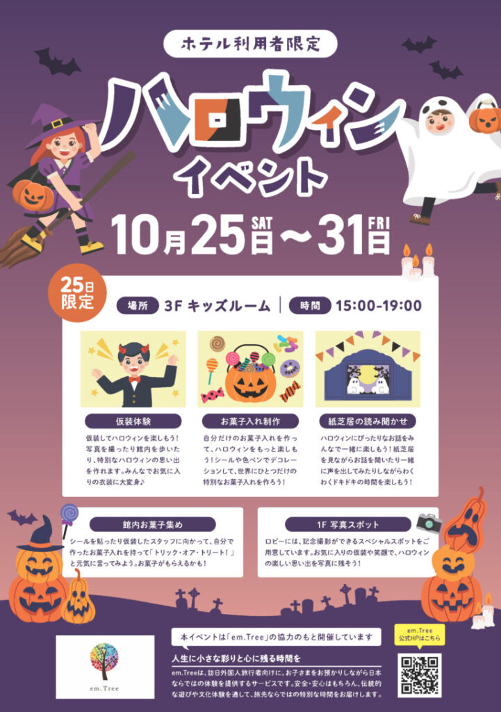 em.Treeもイベントのお手伝いをさせていただきます。秋のひととき、思い出に残るハロウィンをぜひ体験してください♪
